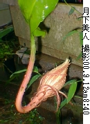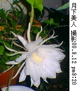 月下美人(げっかびじん)別名: --- 原種には、鳳凰の舞,待宵孔雀などがある。僕のうちの庭で今咲いている花撮影 --- 2000.9.12 右写真午前8時40分 左写真午後9時20分 このように育ててみました。 草齢 --- 購入後約3ヶ月 環境 --- 鉢植え 日当り - やや良 土 ----- 赤土、砂、軽石 肥料 --- 8月下旬配合肥料一つまみを鉢内外周部に、9月上旬液肥を2回 水 ----- ほぼ毎日たっぷりと 分類 --- サボテン科クジャクサボテン属 原産地 - メキシコから中南米、ブラジル 特性 --- 多肥、日当を好む。寒さに弱い。 花言葉 --- 備考 --- 昨夜咲いた木のもう一つの枝にもう一つの花が、1日後の今日、咲きました。 大人の手を一杯に広げたよりももう少し大きいほどです。 今年3度目です。同時期に2個(以上)咲いたのはこれが初めてです。 8月18日に2度目の開花でしたが、その花の落花後すぐに新しく次の蕾を付けました。 昨夜24日目に今年第3回の開花となり、今夜続いて今回2個目が咲きました。 こんなに頻繁に月下美人の花を楽しめるとは知りませんでした。 昨日に続き台風と秋雨前線の影響で断続的に土砂降りとなっている中で、今夜も見事に開花してくれました。 懐中電灯で照らすと、雨の暗闇の中に真っ白な大きい美人花がくっきりと浮かび上がります。 すばらしい独特の花の香が、雨の中、隣のその隣のうちまで漂っています。 これと同じ木に、昨夜(9月11日に)咲いた花 これと同じ木に、8月18日に今年第2回目の咲いた花 これと同じ木に、7月8日に今年第1回目の咲いた花 ご意見、ご感想を こちらのメ−ルで送ってください。 |
