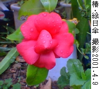 椿・絵日傘(えひがさ)別名:僕のうちの庭で今咲いている花撮影 --- 2001.4.9 掲載 2001.4.15 このように育ててみました。 樹齢 --- 購入後半年 環境 --- 鉢植え 日当り - 半日陰 土 ----- 赤玉土主体? 肥料 --- 秋に液肥2度 水 ----- 普通 分類 --- ツバキ科ツバキ属 原産地 - 日本、中国、東南アジア 特性 --- 半日陰の排水の良い所を好む 花言葉 --- 白色:申し分のない魅力、紅色:気取らない優美さ 備考 --- もう何ともすばらしい花です。 濃い赤色のふっくらとした様子は何とも魅力的です。 咲き始めて4〜5日待っても花弁が全開せず、しべ(蕊)が見えないままです。 写真は、しべが見えない状態そのものの様子です。 小雨の後の雨粒が花弁に残っている状態で、これまたすばらしい様(さま)です。 落花後、花を拾い上げ、花弁を開いて見ると中に黄色い蕊(しべ)が見つかりました。 大変奥ゆかしい椿の花です。 ただ、僕の持っている本では、絵日傘は八重で白地に濃紅色の縦絞りがある花と書かれていますが、写真の花はそれとは全く異なります。 半年前に買ったもので、買ったときのラベル(名札)には、"絵日傘" と書かれていました。そのラベルはそのまま今もこの花の鉢に挿されたままです。 どこがどこでどう間違ったのでしょう。 ご意見、ご感想を こちらのメ−ルで送ってください。 |
