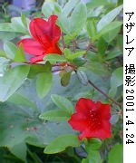 アザレア(赤黒花)別名:ベルジアンアザレア、オランダツツジ僕のうちの庭で今咲いている花撮影 --- 2001.4.24 掲載 --- 2001.4.28 このように育ててみました。 樹齢 --- 15年 環境 --- 庭植え 日当り - 半日陰 土 ----- 赤土 肥料 --- 春先に化成肥料1度 水 ----- 自然の雨 分類 --- ツツジ科ツツジ属 原産地 - 日本、中国 特性 --- 寒さにやや弱い、夏は半日陰 花言葉 --- 備考 --- 赤黒い不気味なほどの見事な花です。 写真は事実よりやや明るく写っています。 15年前に、鉢植えをス−パ−で買って、すぐ地植えにしましたが、2〜3年後に一度数輪咲いてから、その後全く咲きませんでした。 それが、今年全く久しぶりに開花しました。 しかも、数輪以上、20輪以上の蕾と花が着いています。 感動的です。15年前の色々な事柄が思い浮かびます。 ご意見、ご感想を こちらのメ−ルで送ってください。 |