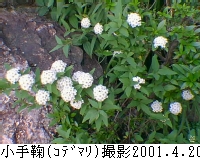 小手毬(こでまり)別名:てまりばな、すずかけ(古名)僕のうちの庭で今咲いている花撮影 --- 2001.4.20 掲載 --- 2001.4.28 このように育ててみました。 樹齢 --- 3年 環境 --- 鉢植え 日当り - 半日陰 土 ----- 鹿沼土主体 肥料 --- 春〜秋に液肥4〜5度 水 ----- やや多目 分類 --- バラ科シモツケ属 原産地 - 中国 特性 --- 水はけのよい日当たりを好む 花言葉 --- 努力 備考 --- 今年は見事に沢山の花が咲きました。 小さい丸い花の集まりは何ともほほえましく感じます。 花期が長く、長い間の観賞ができます。 ご意見、ご感想を こちらのメ−ルで送ってください。 |