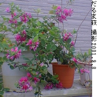 環境 --- 鉢植え 日当り - 良 土 ----- 鹿沼土主体、赤玉土、腐葉土 肥料 --- 春〜秋液肥3−4度 水 ----- やや多目 分類 --- マメ科ハギ属、落葉低木 原産地 - 日本等 特性 --- 日当たりの乾燥地を好む、やせた土でも育つ 花言葉 --- 想い 備考 --- 8月31日に本格的に咲き始め、9月8日の今、咲き誇っています。 鉢植えでも、こんなに沢山咲いてくれています。これからまだまだ咲き続けてくれることでしょう。 ご意見、ご感想を こちらのメ−ルで送ってください。 または、下の BOX 中にご記入下さい。 |