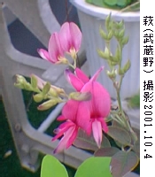武蔵野萩別名 ---僕のうちの庭で今咲いている花撮影 --- 2001.10.4 このように育ててみました。 樹齢 --- 2年 環境 --- 鉢植え 日当り - 良 土 ----- 鹿沼土主体、赤玉土、腐葉土 肥料 --- 春〜秋液肥4〜5度 水 ----- やや多目 分類 --- マメ科ハギ属、落葉低木 原産地 - 日本等 特性 --- 日当たりの乾燥地を好む、やせた土でも育つ 花言葉 --- 想い 備考 --- 蕾が沢山着いていたのですが、水切れを起こさせてしまい、ほとんどすべての蕾が枯れてしまいました。 残ったわずかの蕾がぽつりぽつりと咲き続いています。 花そのものは写真のように見事です。 ご意見、ご感想を こちらのメ−ルで送ってください。 または、下の BOX 中にご記入下さい。 |