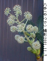 八手(やつで)別名:僕のうちの庭で今咲いている花撮影 --- 写真:2001.11.7 このように育ててみました。 樹齢 --- 20年 環境 --- 庭植え 日当り - 軒下の半日陰 土 ----- 赤土 肥料 --- 春先化成肥料1度 水 ----- 軒下の自然の雨 分類 --- ウコギ科ヤツデ属、常緑低木 原産地 - 特性 --- 半日陰を好む 花言葉 --- 分別 備考 --- 白い粉のふいたような花が咲きました。 茎の頂上に散形花序の集まった大形の円錐花序をつけています。 その花序には多数の小花をつけています。 花後には果実がつき、来年5月頃には黒く熟すことでしょう。 ご意見、ご感想を こちらのメ−ルで送ってください。 |