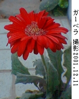 ガ−ベラ・赤花別名:センボンヤリ(千本槍)、ハナグルマ(花車)僕のうちの庭で今咲いている花撮影 --- 写真:2001.12.11 このように育ててみました。 草齢 --- 1年 環境 --- 鉢植え 日当り - 半日陰 土 ----- 鹿沼土主体、赤玉土、腐葉土 肥料 --- 春〜秋に液肥5〜6度 水 ----- 普通〜やや多目 分類 --- キク科センボンヤリ属 原産地 - 南アフリカ 特性 --- 日当たり、肥沃な砂質壌土を好む 花言葉 --- 神秘 備考 --- 春に買ったガ−ベラですが、寒くなった12月にも咲きました。 8度以上の温度があれば開花するようです。 寒くなったこの時期に真っ赤な円形のこの花は感動的な花です。 ご意見、ご感想を こちらのメ−ルで送ってください。 |