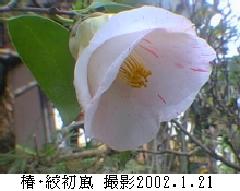 椿・絞り初嵐別名:僕のうちの庭で今咲いている花撮影 --- 写真:2002.1.21 このように育ててみました。 樹齢 --- 3年 環境 --- 鉢植え 日当り - 半日陰 土 ----- 鹿沼土主体 肥料 --- 春−秋液肥4−5度 水 ----- 普通 分類 --- ツバキ科ツバキ属 原産地 - 日本、中国、東南アジア 特性 --- 水はけ良い半日陰を好む 花言葉 --- 紅色:気取らない優美さ、白色:魅力 備考 --- 昨年より約1ヶ月遅い開花です。 極く薄いピンク色の地に赤の絞りが少し入ったおとなしい花です。 侘び助よりも少し大きめですが、茶花になる品のある花です。 今年は2個しか着花していません。 ご意見、ご感想を こちらのメ−ルで送ってください。 |
