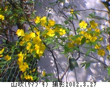 山吹(やまぶき)別名: 面影草、山振、夜麻夫枝僕のうちの庭で今咲いている花撮影 --- 写真:2002.3.27 このように育ててみました。 樹齢 --- 26年 環境 --- 庭植え 日当り - 木陰 土 ----- 赤土 肥料 --- 春先に一度化成液肥 水 ----- 自然の雨 分類 --- バラ科ヤマブキ属 原産地 - 日本、中国 特性 --- 水はけのよい日当たり〜半日陰を好む 花言葉 --- 気品が高い、待ちかねる 備考 --- 今年は早く、3月中旬に咲き始めました。 一重の山吹です。昨年同様、今年も沢山の花を咲かせてくれました。 文字通り山のように吹き出る感じです。 木漏れ日の太陽光線に、金色の反射光を放ち輝き、春も一杯といった感じです。 ご意見、ご感想を こちらのメ−ルで送ってください。 |