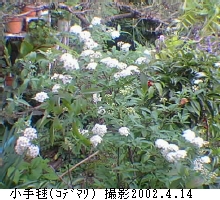 小手毬(こでまり)別名:てまりばな、すずかけ(古名)僕のうちの庭で今咲いている花撮影 --- 2002.4.14 このように育ててみました。 樹齢 --- 4年 環境 --- 鉢植え 日当り - 半日陰 土 ----- 鹿沼土主体 肥料 --- 春〜秋に液肥4〜5度 水 ----- やや多目 分類 --- バラ科シモツケ属 原産地 - 中国 特性 --- 水はけのよい日当たりを好む 花言葉 --- 努力 備考 --- 昨年以上に、今年も見事に沢山の花が咲きました。 6号鉢植えでも、こんなに見事に咲いてくれました。 小さい丸い花の集まりは何ともほほえましく感じます。 花期が長く、長い間の観賞ができるのが楽しみです。 ご意見、ご感想を こちらのメ−ルで送ってください。 |