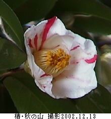 椿・秋の山別名:僕のうちの庭で今咲いている花撮影 --- 写真:2002.12.13 このように育ててみました。 樹齢 --- 21年 環境 --- 庭植え 日当り - 半日陰 土 ----- 赤土 肥料 --- 春先化成肥料1度 水 ----- 自然の雨 分類 --- ツバキ科ツバキ属 原産地 - 中国 特性 --- 半日陰と排水を好む 花言葉 --- 備考 --- 今年は秋にはほんの数輪しか咲きませんでしたが、ここ12月になって、沢山の花が開いています。 椿の中では年内に咲く種で、やや早い開花です。 白地に、少な目の赤い斑が入り、何とも言えない上品さを醸し出しています。 ご意見、ご感想を こちらのメ−ルで送ってください。 |