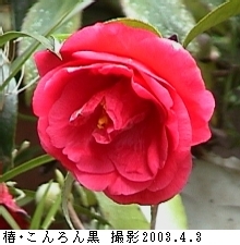 椿・崑崙黒(こんろんこく)別名:僕のうちの庭で今咲いている花撮影 --- 2003.4.3 掲載 2002.4.5 このように育ててみました。 樹齢 --- 3年 環境 --- 鉢植え 日当り - 半日陰 土 ----- 鹿沼土主体、赤玉土、腐葉土 肥料 --- 春〜秋に液肥4〜5度 水 ----- 普通 分類 --- ツバキ科ツバキ属 原産地 - 日本、中国、東南アジア 特性 --- 半日陰の排水の良い所を好む 花言葉 --- 白色:申し分のない魅力、紅色:気取らない優美さ 備考 --- 今年も綺麗に咲きました。 購入したときには、「江日傘」の名札が付けられていましたが、咲いた花は江日傘とはほど遠い形と色です。 多分「崑崙黒」だと思います。 もう何ともすばらしい花です。 濃い赤色のふっくらとした様子は何とも魅力的です。 咲き始めて4〜5日待っても花弁が全開せず、しべ(蕊)が見えないままです。 いわゆる、宝珠咲きです。 咲き終わり頃には少し開いて八重咲きもようになります。 写真は、ほぼ開ききった状態です。 一昨年は、落花後、花を拾い上げ、花弁を開いて見ると中に黄色い蕊(しべ)が見つかりました。 大変奥ゆかしい椿の花です。 ただ、僕の持っている本では、絵日傘は八重で白地に濃紅色の縦絞りがある花と書かれていますが、写真の花はそれとは全く異なります。 3年前に買ったもので、買ったときのラベル(名札)には、"絵日傘" と書かれていました。そのラベルはそのまま今もこの花の鉢に挿したままですが、近々のけようと思います。 どこがどこでどう間違ったのでしょう。 top page へ |