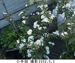 小手毬(こでまり)別名:てまりばな、すずかけ(古名)僕のうちの庭で今咲いている花撮影 --- 2003.5.2 このように育ててみました。 樹齢 --- 5年 環境 --- 鉢植え 日当り - 半日陰 土 ----- 鹿沼土主体 肥料 --- 春〜秋に液肥4〜5度 水 ----- やや多目 分類 --- バラ科シモツケ属 原産地 - 中国 特性 --- 水はけのよい日当たりを好む 花言葉 --- 努力 備考 --- 今年も見事に沢山の花が咲きました。 6号鉢植えでも、こんなに見事に咲いてくれました。 小さい丸い花の集まりは何ともほほえましく感じます。 花期が長く、長い間の観賞ができるのがすばらしいです。 |