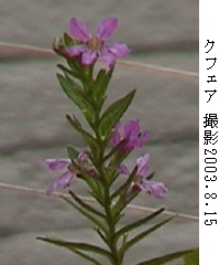 クフェア・ヒソピフォリア・赤花別名 ---僕のうちの庭で今咲いている花撮影 --- 2003.8.15 このように育ててみました。 樹齢 --- 1年 環境 --- 鉢植え 日当り - 良 土 ----- 鹿沼土主体、赤玉土、腐葉土 肥料 --- 春〜秋に液肥4〜5度 水 ----- 普通 分類 --- ミソハギ科クフェア(タバコソウ)属、多種類あり 原産地 - アメリカ大陸(メキシコが中心) 特性 --- 日当たり、水はけを好む 花言葉 --- 備考 --- 小さい可愛い赤花です。 サザンクロスに似た形です。 7月から次々と咲き続けています。 クフェアは多種類あるようで、写真と同じ種類で白花のもいいものです。 |