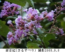 百日紅(ひゃくじっこう)(さるすべり)僕のうちの庭で今咲いている花撮影 --- 2003.9.8 このように育ててみました。 樹齢 --- 16年 環境 --- 鉢植え 日当り - 半日陰 土 ----- 鹿沼土4、赤玉土4、腐葉土2 肥料 --- 春〜秋に液肥4〜5度 水 ----- 普通 分類 --- ミソハギ科、サルスベリ属 原産地 - 中国南部 特性 --- 日当りと水はけの良い土地を好む 花言葉 --- 雄弁 備考 --- 昨年4月下旬に植え替えました。 今年も昨年同様、早々と7月上旬に咲き始めました。 8月上旬頃しばらく開花を休んでいましたが、8月下旬からまた開花を続けました。 夏に赤花のサルスベリもいいですが、赤紫花はそれなりに優雅でいいと思います。 top page へ |
