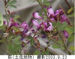 萩(はぎ)・土佐地物別名 ---我が家の庭で今咲いている花撮影 --- 2003.9.23 このように育ててみました。 樹齢 --- 1年 環境 --- 鉢植え 日当り - 良 土 ----- 鹿沼土主体、赤玉土、腐葉土 肥料 --- 春〜秋液肥3〜4度 水 ----- やや多目 分類 --- マメ科ハギ属、落葉低木 原産地 - 日本等 特性 --- 日当たりの乾燥地を好む、やせた土でも育つ 花言葉 --- 想い 備考 --- かなり華々しく咲きました。 夏前はやや不作の感じでしたが、夏になり勢いが増して、沢山の花を付けました。 9月一杯咲き続けています。 |