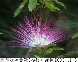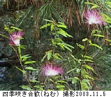 7月下旬に咲いた合歓の木の花が、1ヶ月後の8月下旬にまた咲き、またまた10月上旬にも咲き、今11月上旬にも咲きました。