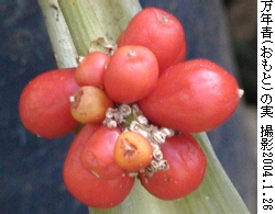 万年青(おもと)の実別名:僕のうちの庭で今咲いている花撮影 --- 写真:2004.1.26 このように育ててみました。 樹齢 --- 20年 環境 --- 鉢植え 日当り - 木漏れ日 土 ----- 鹿沼土主体、赤玉土 肥料 --- 春〜秋液肥4〜5度 水 ----- 普通 分類 --- ユリ科オモト属 原産地 - 日本、中国、台湾 特性 --- 水はけ良い半日陰を好むが、乾燥は好まない。 花言葉 --- 備考 --- 派手さのない植物ですが、緑の少ないこの冬の時期に朱色の実だけはたの植物にまして目立ちます。 しかし決して派手ではなく、落ち着いたたたずまいです。 古典植物らしい趣です。 top page へ |