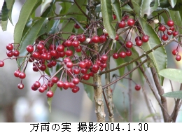 環境 --- 庭植え 日当り - 木漏れ日 土 ----- 赤土 肥料 --- 春先に化成肥料1度 水 ----- 自然の雨 分類 --- ヤブコウジ科ヤブコウジ属 原産地 - 日本、中国、インド、インドシナ等 特性 --- 半日陰を好む 花言葉 --- 備考 --- 今年も万両の実が赤黒く熟れました。 正月前後のこの赤い実はおめでたい気にさせてくれます。 庭のあちこちで赤い実をぶら下げています。 昨年付いた白実の万両の方には、今年は実が付いていないようです。 top page へ |