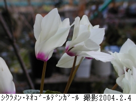 シクラメン・ネオゴ−ルデンガ−ル品種名は「ホワイト・ウイズ・カ−ミン・アイ」が本当のように思います。別名: 僕のうちの庭で今咲いている花撮影 --- 写真:2004.2.4 このように育ててみました。 草齢 --- 半年 環境 --- 鉢植え 日当り - 半日陰 土 ----- 鹿沼土主体、赤玉土、腐葉土 肥料 --- 秋からなし 水 ----- 普通 分類 --- サクラソウ科シクラメン属 原産地 - 地中海東北部沿岸 特性 --- 暑さを嫌い、寒さには強い 花言葉 --- はにかみ、内気、かこった喜び 備考 --- 真っ白な花びらに底紅の入る大変清楚で愛らしい花です。 普通〜やや大型の花です。 黄花のネオゴ−ルデンガ−ルという名札のある鉢を買ったのですが、写真のような白地に底紅の花です。 底紅の紅色はやや紫がかっています。 top page へ |