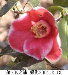 椿・玉之浦(たまのうら)別名:僕のうちの庭で今咲いている花撮影 --- 2004.2.18 このように育ててみました。 樹齢 --- 8年 環境 --- 鉢植え 日当り - 半日陰 土 ----- 鹿沼土主体 肥料 --- 春〜秋液肥4〜5度 水 ----- 普通 分類 --- ツバキ科ツバキ属 原産地 - 日本、中国、東南アジア 特性 --- 水はけ良い半日陰を好む 花言葉 --- 紅色:気取らない優美さ、白色:魅力 備考 --- 赤地に白覆輪の掛かった何とも魅惑的な花です。 この魅力をどう表現したらよいのでしょう。 今年は20個ほどの蕾がついています。 写真の花は第1番目の開花のものです。 濃紅色に白覆輪の一重、中輪、筒〜ラッパ咲、筒蕊 産地:長崎・五島 top page へ |