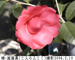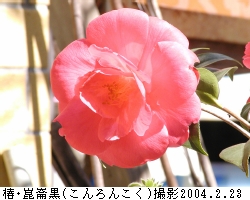 椿・崑崙黒(こんろんこく)別名:僕のうちの庭で今咲いている花撮影 左 --- 2004.2.18 撮影 右 --- 2004.2.23 このように育ててみました。 樹齢 --- 4年 環境 --- 鉢植え 日当り - 半日陰 土 ----- 鹿沼土主体、赤玉土、腐葉土 肥料 --- 春〜秋に液肥4〜5度 水 ----- 普通 分類 --- ツバキ科ツバキ属 原産地 - 日本、中国、東南アジア 特性 --- 半日陰の排水の良い所を好む 花言葉 --- 白色:申し分のない魅力、紅色:気取らない優美さ 備考 --- 趣の異なった椿の花です。 今年も綺麗に咲きました。 4年前に購入したときには、「江日傘」の名札が付けられていましたが、翌年に咲いた花は江日傘とはほど遠い形と色です。 多分「崑崙黒」だと思います。 もう何ともすばらしい花です。 濃い赤色のふっくらとした様子は何とも魅力的です。 咲き始めて4〜5日待っても花弁が全開せず、しべ(蕊)が見えないままです。 いわゆる、宝珠咲きです。 咲き終わり頃には少し開いて八重咲きもようになります。 写真右は、開ききった状態で、蕊が見えます。 3年前には、落花後、花を拾い上げ、花弁を開いて見ると中に黄色い蕊(しべ)が見つかりました。 大変奥ゆかしい椿の花です。 top page へ |