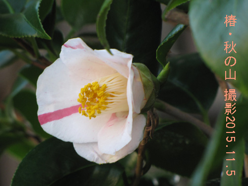 椿・秋の山(つばき・あきのやま)別名:我が家の庭で今咲いている花撮影--- 2015.11.5 このように育ててみました。 樹齢 --- 31年 環境 --- 庭植え 日当り - 半日陰 土 ----- 赤土主体 肥料 --- 春先に化成肥料1度 水 ----- 自然の雨 分類 --- ツバキ科ツバキ属 原産地 - 日本、中国、東南アジア 特性 --- 半日陰の排水の良い所を好む。 花言葉 --- 白色:申し分のない魅力、紅色:気取らない優美さ 備考 --- 椿・秋の山の花です。 秋の山は色々な模様に咲分けますが、ここに3種の咲き分けを掲載しました。 通常は写真中央のような白地に赤の縦縞の入った花が多く咲きます。それが「秋の山」らしい花です。 この通常のものよりも赤の少ない花と、ほとんどすべて赤で染まった花も掲載しました。 これらそれぞれの中間ほどのものもよく見かけます。 9月ころから咲き始め、春まで次々と咲き続けてくれます。 育て甲斐のある椿です。 産地:江戸 一重、筒〜ラッパ咲き、小〜中輪 園芸種の花・木の花の 目次ページ へ 山野草 はこちら 果実とその花 はこちら top page へ |