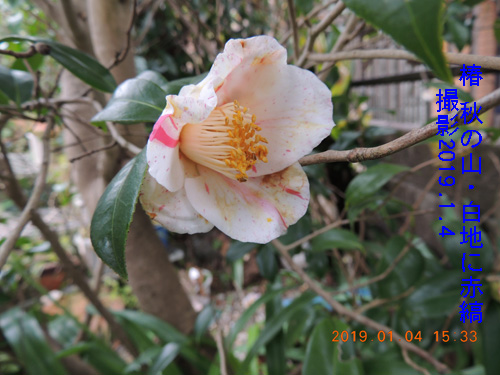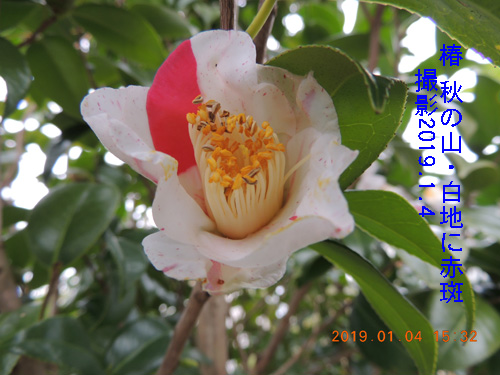 分類 --- ツバキ科ツバキ属原産地 - 日本、中国、東南アジア 特性 --- 半日陰の排水の良い所を好む。 花言葉 --- 白色:申し分のない魅力、紅色:気取らない優美さ 備考 --- 椿・秋の山の花3種です。 椿・秋の山の木には色々な模様・色合いの花が咲いてくれます。 今日(2019.1.4)撮影できた3種を掲載しました。 まだ他に何種類かが咲きますが、それらが咲いたときにまた掲載予定です。 一番上の全体が赤い花は、ここ数年前から増えています。 一番多いのは写真中のような白地に赤の斑が入るものですが、 写真のように赤斑が1個だけのものや、2個、3個等のものもあります。 9月頃から咲き始め、春まで次々と咲き続けてくれる素晴らしい花です。 育て甲斐のある椿です。