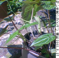 約10cmの仏炎ほうにおおわれた肉穂花序の先端から伸びる付属体は20cmほどあります。