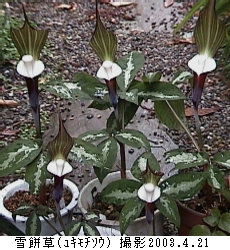 仏炎ほう(はなびら)に包まれるようにして見える白い付属体(虫よせの棒)が雪のように白く形が丸いお餅のようなところからきた草の名だそうです。