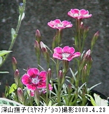 撮影 --- 2003.4.23 草齢 --- 1年 環境 --- 鉢植え、 日当たり午前中2〜3時間 土 ----- 鹿沼土、赤土、腐葉土 肥料 --- 春〜秋に液肥4〜5回 水 ----- 普通 備考 --- 可愛らしい撫子です。 花の大きさは通常の撫子の半分位です。 やや赤色の濃い、いい花です。