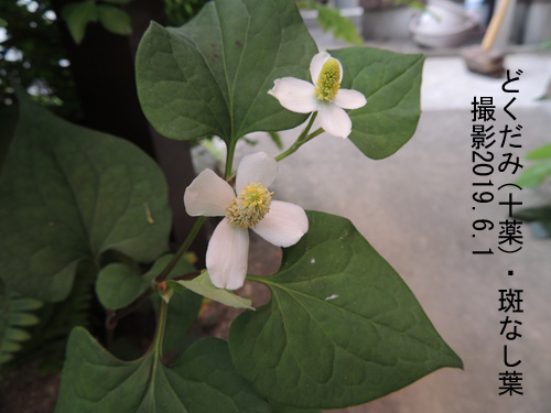 備考 ----- 鮮やかな斑入り葉と斑無し葉のどくだみの花です。