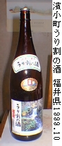 製造年月 11.6.1 (1999年6月)試飲時期 1999.10 月 味わい 清酒と言える味です。いわゆる旧2級酒です。最近こおいう酒が少なくなり寂しく思われます。 うり割の滝の水を使用しているのでしょうか。そうだという説明文はありませんでしたのでそうなのかそうでないのかは分かりません。 アルコ−ル分: 15.0度以上16.0度未満 価格: 一升瓶1,400円前後でした。 原料米: 精米歩合: 酒造会社:濱小町酒造株式会社 福井県小浜市駅前町6番35号 |
