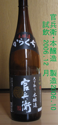 官兵衛・本醸造(兵庫県)製造年月 --- 平成18年(2006年)10月中旬 BAA 試飲時期 --- 平成18年(2006年)12月 級 --------- (特撰)本醸造 からくち アルコ−ル分 --- 15度以上16度未満 原材料名 --- 米・米麹・醸造アルコール 精米歩合 --- 70% 甘辛性 ----- からくち 価格 ------- 1,290 円でした。 醸造会社 ---- 名城酒造株式会社 兵庫県姫路市豊富町2222の5 味わい 当時のメモ --- 常温: 特に強い味や刺激はない。 それが飲みよくすうすう入る。 芳醇性は少し感じる程度にあり。 燗: 常温同様飲みやすい。 昨日まで飲んだ4合瓶「美の川」と同じような味。 備考: |