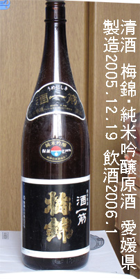 梅錦(うめにしき)・純米吟醸原酒(愛媛県)製造年月 --- 平成17年(2005年)12月 試飲時期 --- 平成18年(2006年)1月 級 --------- 純米吟醸原酒 アルコ−ル分 --- 16.0度以上17.0度未満 価格 ------- 一升瓶 円でした。 原材料名 --- 米・米麹 米100% 醸造会社 --- 山川酒造株式会社 愛媛県川之江市金田町 味わい 当時のメモ --- 常温: 旨い、芳醇性あり、こくがある。。 燗: 旨味、芳醇性、こく 皆、常温同様だ。。 やはり、この酒は何時飲んでも旨い。 |