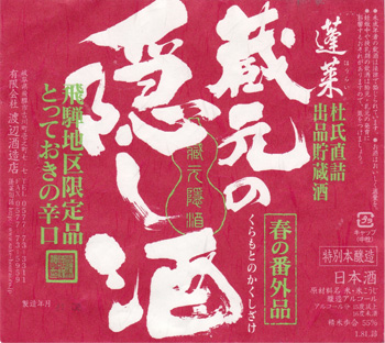 蔵元の 隠し酒(くらもとのかくしざけ)・特別本醸造(今年2本目) (岐阜県)製造年月 --- 平成21年(2009年)3月 試飲時期 --- 平成21年(2009年)5月 級 --------- 特別本醸造 アルコ−ル分 --- 15度以上16度未満 原材料名 --- 米・米こうじ・醸造アルコール 精米歩合 --- 55 % 価格 ------- 一升瓶 約2,000 円程でした。 醸造会社 ---- 有限会社 渡辺酒造店 岐阜県飛騨市古川町壱之町七ー七 TEL: 0577-73-3311 ホームページ(蓬莱旬話): http://www.sake-hourai.co.jp/ 味わい 当時のメモ ---常温:やや芳醇で旨味あり。呑みよい酒だ。やや苦辛味もありいい酒だ。 燗:芳醇性あり、芳香あり。いい苦辛い味もある。 |