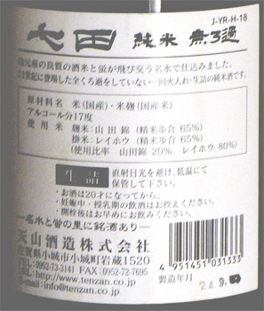 七田・純米無ろ過(佐賀県)製造年月 --- 2012年(平成24年)9月 試飲時期 --- 2012年(平成24年)11月 級 --------- 純米無ろ過 原材料名 --- 米(国産)・米麹(国産米) アルコ−ル分 --- 17度 精米歩合 --- 麹米65%(山田錦) 掛米65%(レイホウ) 使用比率 山田錦20% レイホウ80% 日本酒度 --- 酸度 ------- 価格 ------- 一升瓶 約2,520 円でした。 醸造会社 ---- 天山酒造株式会社H 佐賀県小城市小城町岩藏1520 TEL: 0952-73-3141 URL: http://www.tenzan.co.jp 味わい 当時のメモ ---常温:燗:備考: |