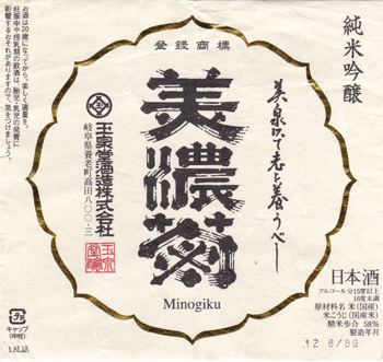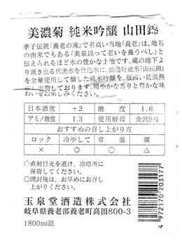 美濃菊(みのぎく)・純米吟醸(岐阜県)製造年月 --- 2012年(平成24年)8月BG 試飲時期 --- 2012年(平成24年)9月 級 --------- 純米吟醸 原材料名 --- 米(国産)・米こうじ(国産米) アルコ−ル分 --- 15度以上16度未満 精米歩合 --- 58 % 日本酒度 --- +2 酸度 ------- 1.6 価格 ------- 一升瓶 円でした。 醸造会社 ---- 玉泉堂酒造株式会社 岐阜県養老町高田800・3 味わい 当時のメモ ---常温:燗:備考: |