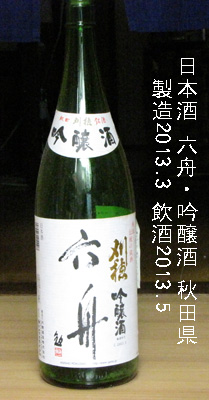 六舟・吟醸酒(高知県)製造年月 --- 平成25年(2013年)3月試飲時期 --- 平成25年(2013年)5月 級 --------- 吟醸酒 アルコ−ル分 --- 15度 価格 ------- 一升瓶 円でした。 原材料名 --- 米(国産)・米こうじ(国産米)・醸造アルコール 精米歩合 --- 57% 日本酒度 --- 醸造会社 --- 秋田清酒株式会社 秋田県大仙市戸地谷字天ケ沢83−1 TEL: 0187-63-1224 ホームページ:http://www.igeta.jp/--- 味わい 当時のメモ ---常温:細く深い味。燗:常温よりも、甘味辛味ともにやや大となる。 |