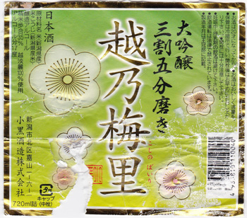 越の梅里(こしのばいり)・大吟醸(新潟県)製造年月 --- 平成25年(2013年)月 試飲時期 --- 平成25年(2013年)月 級 --------- 大吟醸 アルコ−ル分 --- 17度 価格 ------- 720ml 円でした。 原材料名 --- 米(新潟県産)・米こうじ (新潟県産米)・醸造アルコール 精米歩合 --- 35 % 越淡麗100%使用 日本酒度 --- 酸度 ------- 醸造会社 --- 小黒酒造株式会社 新潟市北区嘉山1-6-1 TEL: --- 味わい 当時のメモ ---常温:燗:備考: |