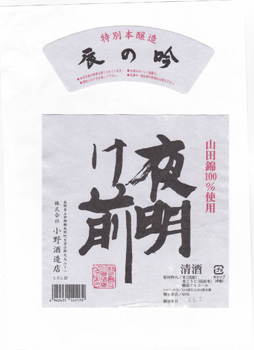 夜明け前(よあけまえ)・特別本醸造(長野県)製造年月 --- 平成25年(2013年)2月試飲時期 --- 平成25年(2013年)4月 級 --------- 特別本醸造 アルコ−ル分 --- 15.0度以上16.0度未満 価格 ------- 一升瓶 2,200 円でした。 原材料名 --- 米(国産)・米こうじ(国産米)・醸造アルコール 精米歩合 --- 60 % 日本酒度 --- 酸度 ------- 醸造会社 --- 小野酒造株式会社 長野県上伊那郡辰野町大手小野992-1 TEL: --- 味わい 当時のメモ ---常温:燗:備考: |