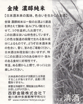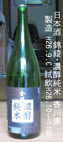 錦綾・濃醇純米酒(香川県)製造年月 --- 平成26年(2014年)9月C 試飲時期 --- 平成26年(2014年)10〜11月 級 --------- 濃醇純米酒 アルコ−ル分 --- 15度以上16度未満 価格 ------- 一升瓶 約1900 円でした。 原材料名 --- 米(国産)、米こうじ(国産米) 精米歩合 --- 75% 日本酒度 --- 醸造会社 --- 西野金陵株式会社 香川県仲多度郡琴平町623 ホームページ - www.nishino-kinryo.co.jp/ 味わい 当時のメモ --- 常温: 芳醇性あり甘辛味も丁度よい。 燗: 常温より芳醇性やや増し旨味もあり。 毎日の晩酌には価格的にも味的にも上等の酒だと思う。 |