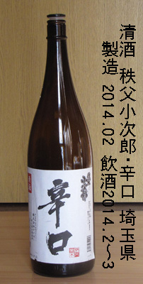 秩父小次郎(ちちぶこじろう) 辛口・普通酒(埼玉県)製造年月 --- 平成26年(2014年)02月 試飲時期 --- 平成26年(2014年)2〜3月 級 --------- 普通酒 アルコ−ル分 --- 15度 価格 ------- 一升瓶 円でした。 原材料名 --- 米(国産)・米麹(国産米)・醸造アルコール 精米歩合 --- % 日本酒度 --- 酸度 ------- 醸造会社 --- 株式会社タイセー 秩父菊水酒造所 埼玉県秩父市下吉田3786-1 ホームページ http://www.chichibu-kikusui.com --- 味わい 当時のメモ ---常温:燗: |