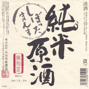 しぼったまんま純米原酒・純米原酒(埼玉県)製造年月 --- 平成26年(2014年)11月IA 試飲時期 --- 平成26年(2014年)12月 級 --------- 純米原酒 アルコ−ル分 --- 17度以上18度未満 価格 ------- 一升瓶 円でした。 原材料名 --- 米(国産)・米こうじ(国産米) 精米歩合 --- 82 % 日本酒度 --- 醸造会社 --- 株式会社 小山本家酒造 さいたま市西区大字指扇1798番地 ホームページ: 味わい 当時のメモ --- 常温: 。 燗: 。 |