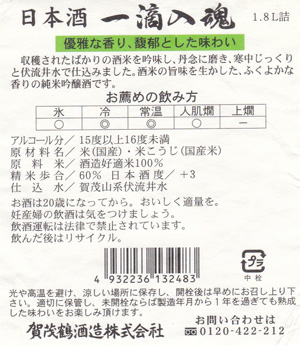 賀茂鶴 (かもつる)・一滴入魂 (広島県)製造年月 --- 平成27年(2015年)07月03日C 試飲時期 --- 平成27年(2015年)9月 級 --------- 純米吟醸酒 アルコ−ル分 --- 15度以上16度未満 精米歩合 --- 60 % 原材料名 --- 米(国産)・米麹(国産米) 原料米: 醸造好適米100% 価格 ------- 一升瓶 2,246 円でした。 日本酒度 --- 酸度 ------- タイプ ----- 醸造会社 ---- 賀茂鶴酒造株式会社 広島県東広島市西条本町四番三十一号1 味わい 当時のメモ ---常温:米藁の香り、即ち稲藁の麹黴の香りがする。芳醇な味で美味しい。 燗:麹黴のいい味がやや変質した味となった。この味がもう少し進むといやな味になりそうだ。 何か植物のふるくて悪くなりかけたような味。 時々そのような味のするお酒に遭遇する。 この酒、今はそこまで行っていないし、今後もそうはならないかも知れない。 備考: |
