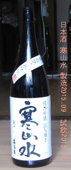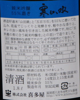 寒山水(かんさんすい)・純米吟醸(福岡県)製造年月 --- 平成27年(2015年)09月 試飲時期 --- 平成27年(2015年)12月 級 --------- 純米吟醸 アルコ−ル分 --- 14度以上15度未満 価格 ------- 一升瓶 2,808 円でした。 原材料名 --- 米(国産)、米麹(国産米) 精米歩合 --- 55% 日本酒度 --- 醸造会社 --- 株式会社 喜多屋 福岡県八女市本町374番地 ホームページ:--- 味わい 当時のメモ ---常温:芳醇性と麹黴(こうじかび)の良き甘味が口の中にすわっと広がる旨い酒。 苦辛味が程よく刺激をしてくれる。 燗:苦辛味がありいい刺激となる。芳醇性があり米麹かびのうまい味が口の中にシワーット広がってくれる。 苦辛味もこのように口の中に広がってくれればもっと良いのだが、それは贅沢。 備考:原料米:山田錦60% 五百万石40% |