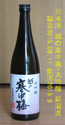 越の寒中梅・大吟醸 (新潟県)製造年月 --- 平成27年(2015年)08月11日試飲時期 --- 平成27年(2015年)9月 級 --------- 大吟醸 アルコ−ル分 --- 15度 原材料名 --- 米・米こうじ・醸造アルコール 価格 ------- 720ml 瓶 円でした。 精米歩合 ---- 50 % 醸造会社 ---- 新潟銘醸株式会社 〒947-0004 新潟県小小谷市東榮1丁目8番39号 味わい 当時のメモ常温:やや芳醇性あり。やや甘いが、いい甘さである。 深味があるいい酒だ。 燗:気にならないいい甘さがある。アルコールのいい刺激もある。 備考: |