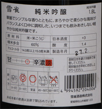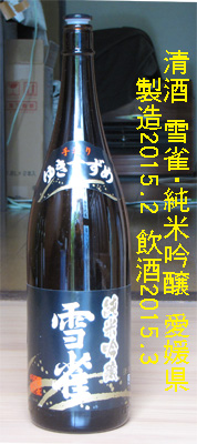 雪雀(ゆきすずめ)・純米吟醸 (愛媛県)製造年月 --- 平成27年(2015年)2月 試飲時期 --- 平成27年(2015年)3月 級 --------- 純米吟醸 アルコ−ル分 --- 14.0度以上15.0度未満 精米歩合 --- 60 % 原材料名 --- 米・米こうじ 価格 ------- 一升瓶 2,250 円でした。 日本酒度 --- +3 酸度 ------- 1.4 タイプ ----- 醸造会社 ---- 雪雀酒造株式会社 愛媛県松山市柳原123 味わい 当時のメモ ---常温:芳醇性・こく があり旨く飲みやすい。燗:常温同様、芳醇性・こくがある。備考: |