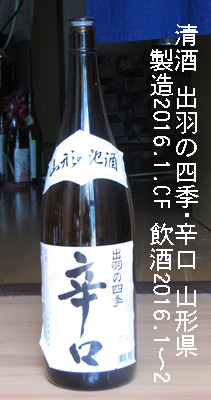 出羽の四季 辛口 普通酒(山形県)製造年月 --- 平成28年(2016年)1月CF 試飲時期 --- 平成28年(2016年)1〜2月 級 --------- 普通酒 アルコ−ル分 --- 15度以上16度未満 価格 ------- 一升瓶 1,490円(年間払い別種12本の1本)でした。 原材料名 --- 米(国産)・米麹(国産米)・ 醸造アルコール・糖類 精米歩合 --- 70% 日本酒度 --- +4.5 酸度 ------- 1.3 醸造会社 --- 浜田株式会社 山形県米沢市窪田町藤泉943-1 TEL: ↓↓↓ 味わい 当時のメモ ↓↓↓常温:芳醇な感じ。とは言っても真の芳醇という感じではない。この値段このクラスで芳醇な味のようなものを 味わえるのだから割安だ。 しかし甘い。肴を変えてみてもみても甘い。 レッテルには「辛口」と書いてある。 芳醇なような味は添加されている糖類から来ているような 気がする。あのカラメルの味。 燗:常温同様だ。甘いお酒の好きな人にはいいお酒だろう。 備考: |