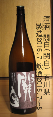 關白[関白](かんぱく) 普通酒(石川県)製造年月 --- 平成28年(2016年)7月 試飲時期 --- 平成28年(2016年)7〜8月 級 --------- 普通酒 アルコ−ル分 --- 15.5 度 価格 ------- 一升瓶 1,609 円(1年間通販中の1本)でした。 原材料名 --- 米(国産)・米麹(国産米)・醸造アルコール・ 糖類・酸味料 精米歩合 --- % 日本酒度 --- 醸造会社 --- 株式会社 加越 石川県小松市今江町9−605 ホームページ: http://www.kanpaku.co.jp ↓↓↓ 味わい 当時のメモ ↓↓↓常温:以前の 1, 2 級酒の通常の味だが、その中では旨い方だ。 燗:常温同様、普通酒の中では旨い方の部類だと感じる。備考: |