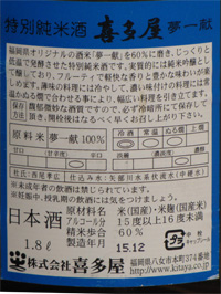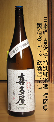 喜多屋(きたや)・特別純米酒(福岡県)製造年月 --- 平成27年(2015年)12月 試飲時期 --- 平成28年(2016年)7月 級 --------- 特別純米酒 アルコ−ル分 --- 15度以上16度未満 価格 ------- 一升瓶 2,398 が 1,919 円でした。 原材料名 --- 米(国産)・米こうじ(国産米) 原料米:夢一献 100 % 精米歩合 --- 60% 日本酒度 --- 醸造会社 --- 株式会社 喜多屋 福岡県八乙女市本町374番地 ホームページ: http://www.kitaya.co.jp ↓↓↓ 味わい 当時のメモ ↓↓↓常温:麹黴の味がする美味しい酒だ。芳醇性がある。 純米酒だけあって、以前の1,2級酒以上の旨い味がする。 燗:燗をしても、芳醇性や旨味は常温同様で、消えない。やはり旨く飲める。 |