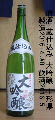 蔵仕込み 大吟醸・大吟醸(山形県)製造年月 --- 平成28年(2016年)4月AB 試飲時期 --- 平成28年(2016年)5月 級 --------- 大吟醸 アルコ−ル分 --- 15度 価格 ------- 一升瓶 約2,000円(別種5本組1万円)でした。 原材料名 --- 米(国産)・米こうじ(国産米)・醸造アルコール 精米歩合 --- 50 % 日本酒度 --- 酸度 ------- 醸造会社 --- 浜田株式会社 山形県米沢市窪田町藤泉943-1 TEL: ホームページ ↓↓↓ 味わい 当時のメモ ↓↓↓常温:刺激がやや小。まずまずの味。 僅かに芳醇性あり、やや辛味もある。 口当たりよく飲める。 燗:常温よりも辛味が大となった。それ以外特徴を感じない。 備考: |