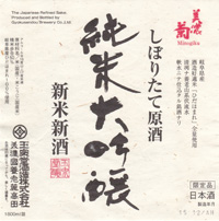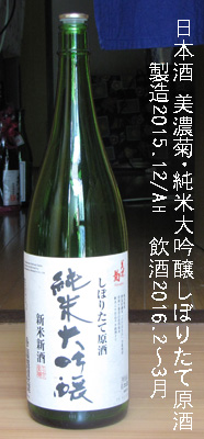 美濃菊 (みのぎく)・純米大吟醸しぼりたて原酒(岐阜県)製造年月 --- 平成27年(2015年)12月AH 試飲時期 --- 平成28年(2016年)2〜3月 級 --------- 純米大吟醸原酒 アルコ−ル分 --- 16度以上17度未満 価格 ------- 一升瓶 1,998 円でした。 原材料名 --- 米(国産)・米こうじ(国産米) 岐阜県産ひだほまれ100%使用 精米歩合 --- 50% 日本酒度 --- 醸造会社 --- 玉泉堂酒造株式会社 美濃國養老麓高田 TEL: 083-252-1877 ↓↓↓ 味わい 当時のメモ ↓↓↓常温:芳醇性少しあり。深味もあり、旨い。 いい刺激と豊かな味。 まろやかで、芳醇で深い味。 燗:常温とほぼ同様。ほのかな甘さは醸造の自然の甘さだ。麹黴のほのぼのとした味がする。 燗をすると、麹黴の香りと味が増して、いい感じで飲める。 この値段(1,998円)でこの旨さはちょっとない。 「 純米、大吟醸、しぼりたて、原酒 」の堂々たる名に 負けない良い酒だ。 こんな値段で買えるのは不思議だ。 購入先は、高知県内のMスーパーマーケット。 |